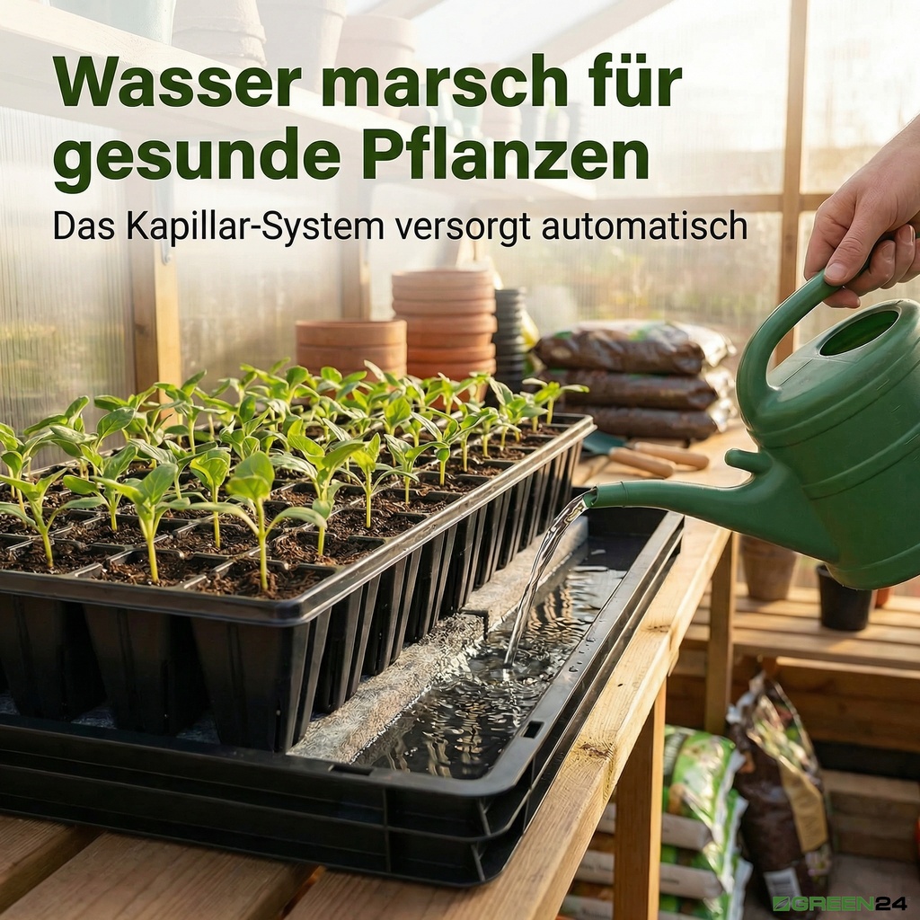 - Ideal zur Anzucht vieler kleiner Pflanzen. Das Anzuchtsystem mit Wasserwanne und Kapillar-Bewässerungsmatte (3l/m²) für eine automatisierte Bewässerung als Kapillarsystem (Wasser wandert automatisch aus der Wanne zu der Topfunterseite).
