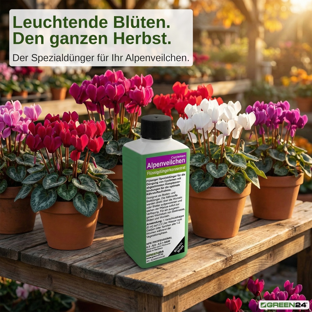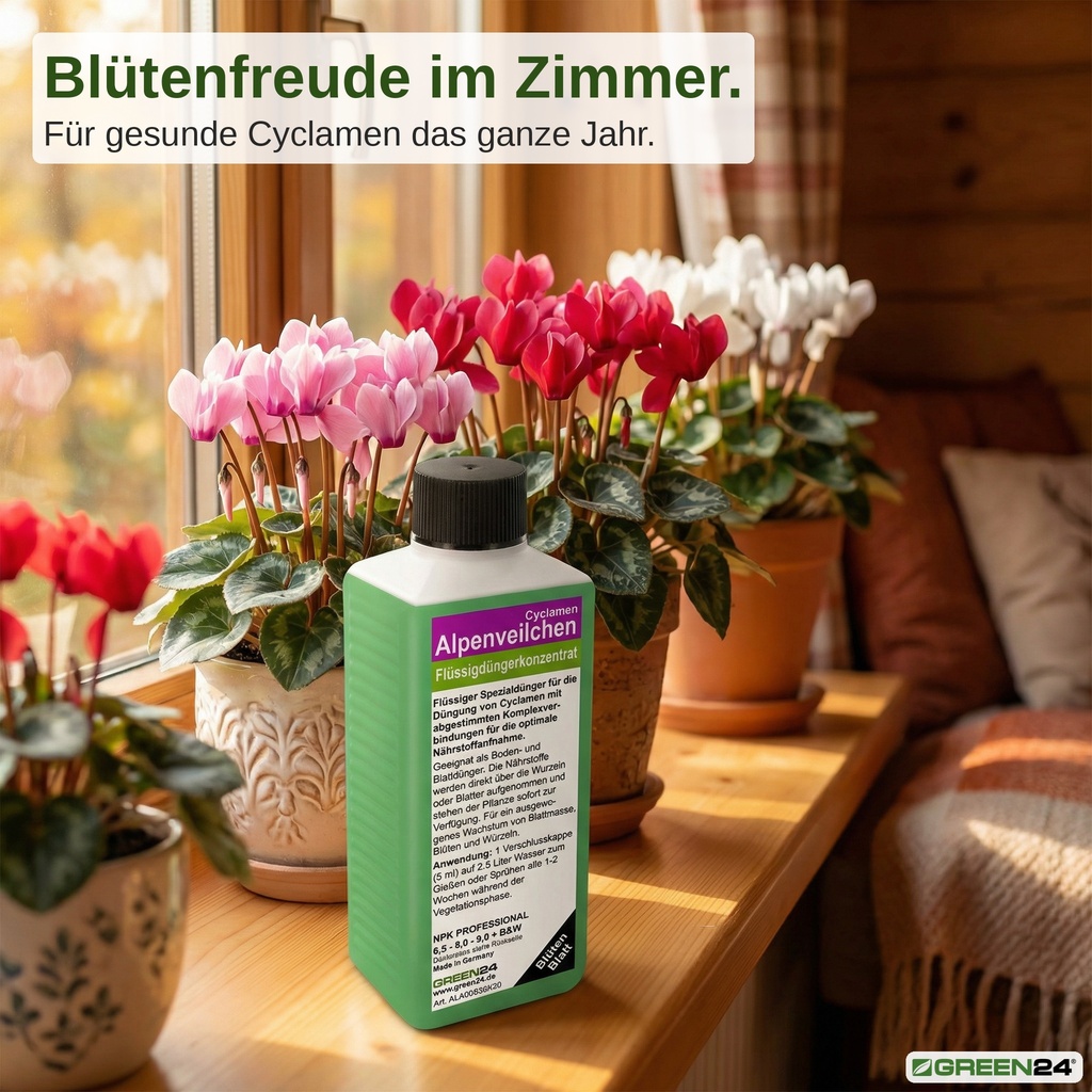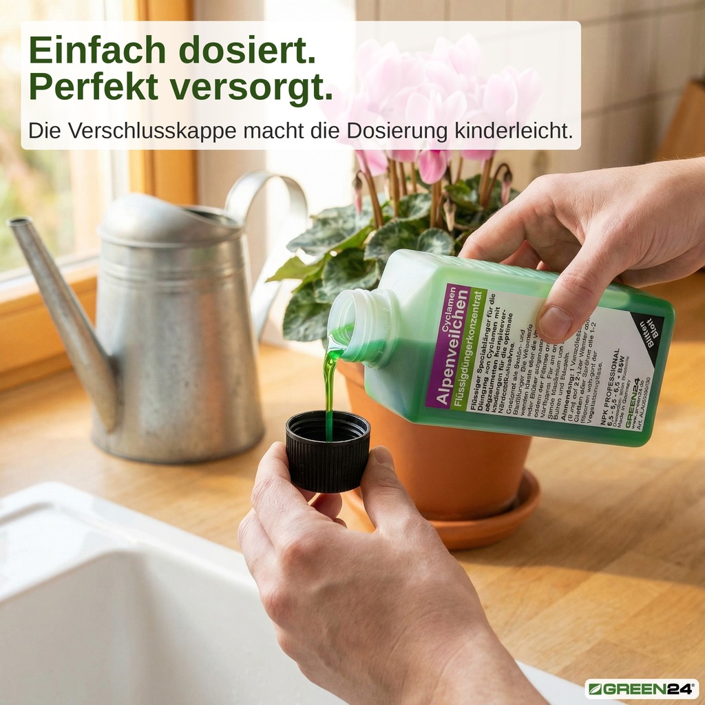 Ein guter Alpenveilchen-Dünger muss die Knolle stärken, die Blütenbildung anregen und gleichzeitig das herzförmige, silbrig gemusterte Blattwerk kräftigen. Genau das leistet der GREEN24 Spezialdünger mit seiner abgestimmten NPK-Formel und einem vollständigen Spurenelementpaket.