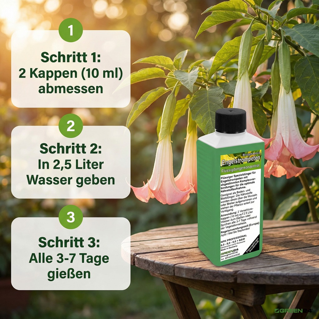 Die Anwendung ist denkbar einfach und wird schnell zur wöchentlichen Routine. Während der gesamten Wachstumsperiode von Frühling bis Herbst wird der Flüssigdünger dem Gießwasser beigemischt. Beobachten Sie, wie Ihre Engelstrompete diese Kraftnahrung gierig aufnimmt und Sie mit einer Blütenpracht belohnt, die alle Erwartungen übertrifft. Mit GREEN24 wird die Pflege Ihrer Engelstrompete zu einem Fest für die Sinne.