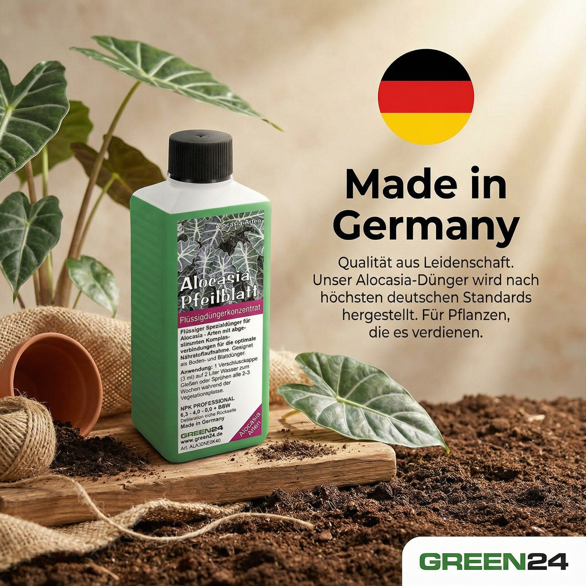 Der GREEN24 Alocasia Dünger ist der präzise abgestimmte Flüssigdünger für alle Pfeilblätter (Araceae). Das Spezialrezept fördert ein sattes Blattgrün, starke Knollen und eine hohe Vitalität. Ideal für Alocasia zebrina, macrorrhizos, wentii, ‘Polly’, ‘Black Velvet’ u.v.m. In der Wachstumszeit liefert er messbare Ergebnisse in wenigen Wochen – sicher dosierbar in Erde und Hydrokultur. Made in Germany, ergiebig und geruchsarm.