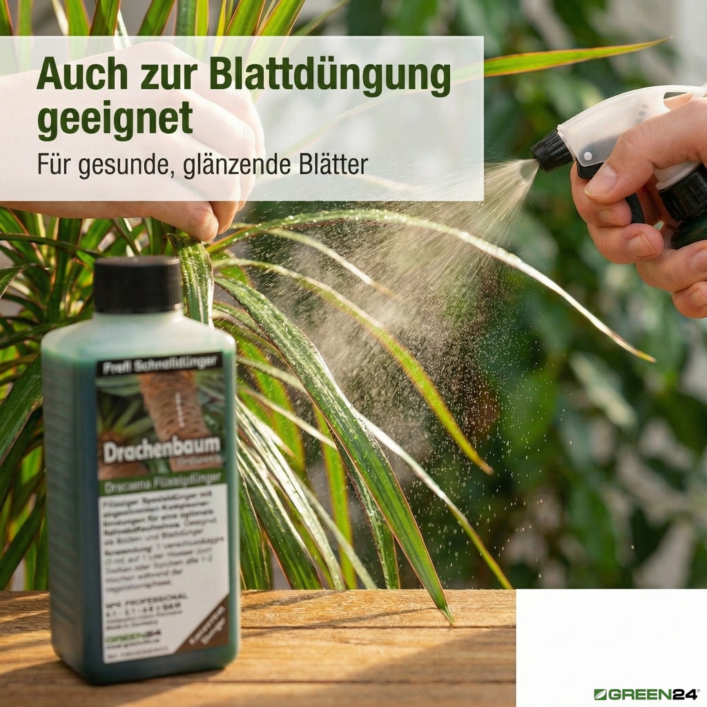 Effektive Blattdüngung: Spezielle Benetzungsmittel sorgen dafür, dass der Dünger fein auf den Blättern verteilt wird und dort haften bleibt. Haftmittel schützen vor dem Abwaschen, während ein Verdunstungsschutz die Nährstoffe länger flüssig und somit aufnahmefähig hält. So kann Ihr Drachenbaum Nährstoffe auch direkt über das Blatt aufnehmen – eine schnelle Hilfe bei akuten Mangelerscheinungen. Die Blattdüngung ist besonders effektiv, wenn Ihre Pflanze bereits Symptome eines Nährstoffmangels zeigt.
