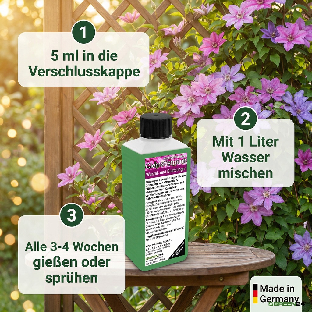 Wir glauben, dass Pflanzenpflege Freude bereiten sollte. Deshalb haben wir unseren Dünger so konzipiert, dass er extrem einfach in der Anwendung ist. Eine halbe Verschlusskappe in zwei Litern Wasser genügt, um Ihre Kletterpflanzen mit allem zu versorgen, was sie für ein gesundes Wachstum benötigen. Egal ob im Beet oder im Kübel, die Anwendung alle zwei bis drei Wochen während der Wachstumsperiode genügt, um eine kontinuierliche Nährstoffversorgung sicherzustellen. Vertrauen Sie auf unsere in Deutschland entwickelte und produzierte Qualität und genießen Sie eine ganze Saison lang die atemberaubende Schönheit Ihrer Clematis.