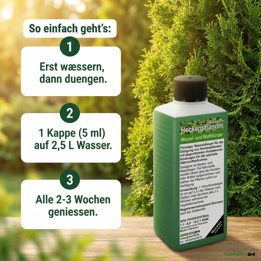 Der Heckenpflanzen Dünger Supreme von GREEN24 wurde genau für diese Anforderungen entwickelt. Er liefert das ausgewogene NPK-Verhältnis, das Laubgehölze und immergrüne Heckenpflanzen benötigen, um dichte Verzweigungen aufzubauen, frisches Grün zu bilden und Mangelerscheinungen dauerhaft zu überwinden.