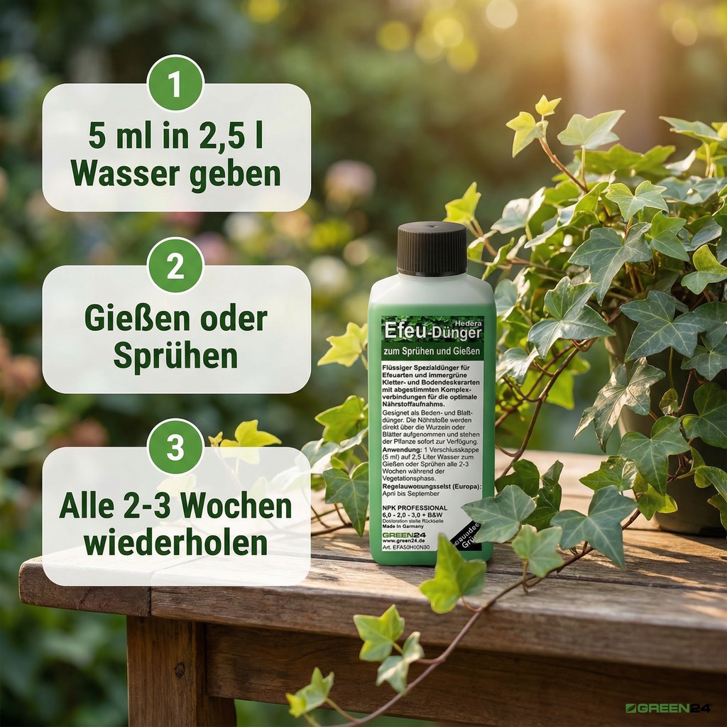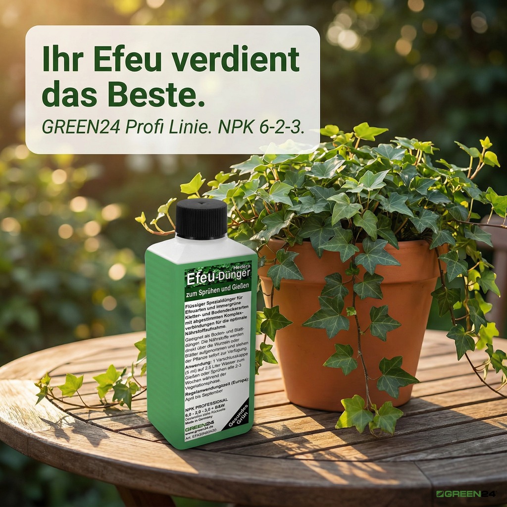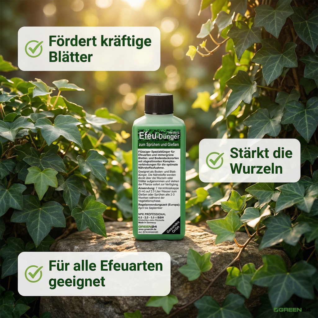 Dieser flüssige Spezialdünger wurde gezielt für die besonderen Ansprüche von Efeuarten (Hedera), Euonymus (Spindelstrauch bzw. Pfaffenhütchen) sowie weiteren immergrünen Kletter- und Bodendeckerarten entwickelt. Die ausgewogene NPK-Formel (6,0+2,0+3,0) liefert genau die Nährstoffe, die diese Pflanzen für ein dichtes, kräftiges und gesundes Wachstum benötigen. Der hohe Anteil an Gesamtstickstoff (6,00% N), wovon ein Teil als Carbamidstickstoff vorliegt, sorgt für eine langanhaltende und schonende Stickstoffversorgung, die das Blattwachstum intensiv anregt und für ein tiefes, sattes Grün sorgt. Wasserlösliches Phosphat (2,00% P2O5) unterstützt die Entwicklung eines starken und weitreichenden Wurzelsystems, was besonders bei Bodendeckern und Kletterpflanzen für eine stabile Struktur und gute Verankerung unerlässlich ist. Das wasserlösliche Kaliumoxid (3,00% K2O) stärkt die Zellwände, verbessert die Widerstandsfähigkeit gegen Trockenheit und erhöht die allgemeine Vitalität der Pflanzen.
