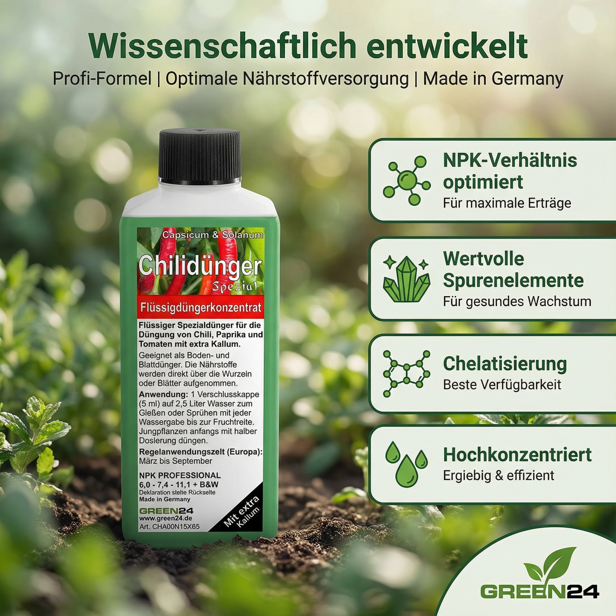 Chilis und Paprika gehören zur Familie der Nachtschattengewächse (Solanaceae) und haben ganz spezielle Nährstoffbedürfnisse, die sich deutlich von anderen Gemüsepflanzen unterscheiden. Als Capsicum-Arten benötigen sie eine präzise abgestimmte Ernährung, um ihr volles Potenzial an Schärfe, Aroma und Ertrag zu entfalten. Unser Spezialdünger wurde gezielt für diese anspruchsvollen Pflanzen entwickelt und berücksichtigt ihre einzigartigen physiologischen Eigenschaften. Die wissenschaftlich fundierte Formel maximiert die Capsaicin-Produktion, intensiviert das sortentypische Aroma und fördert eine außergewöhnlich reiche Ernte mit perfekt ausgereiften, farbenprächtigen Schoten.