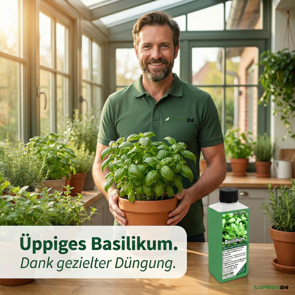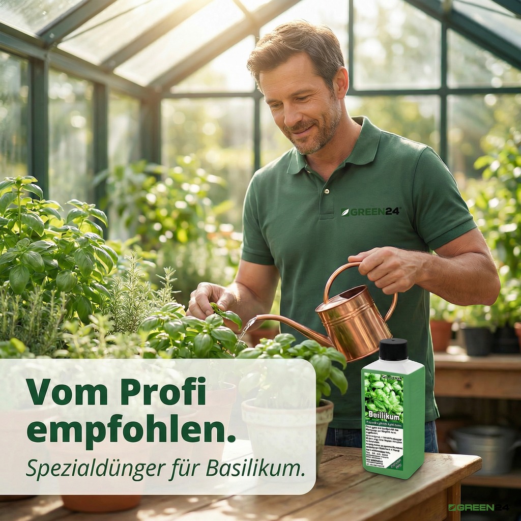 Der GREEN24 Basilikum-Dünger Pro ist exakt auf die Bedürfnisse von Ocimum basilicum zugeschnitten. Die spezialisierte Formel liefert die richtige Menge an Stickstoff, Phosphor und Kalium in dem Verhältnis, das Basilikum für optimales Wachstum braucht.