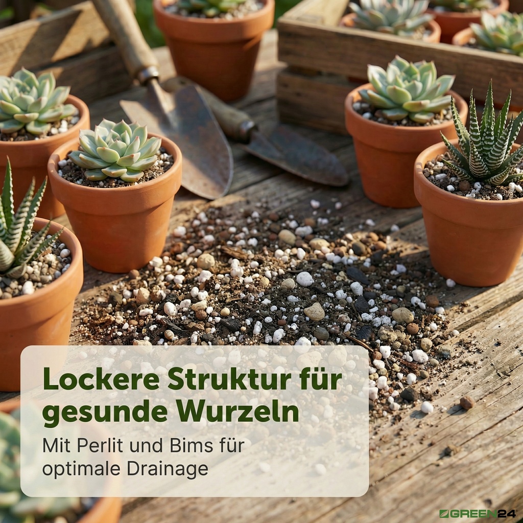 - Hoher Mineralanteil: Bims, Perlit und Sand sorgen für eine extrem hohe Wasserdurchlässigkeit und eine stabile, krümelige Struktur, die nicht verdichtet.