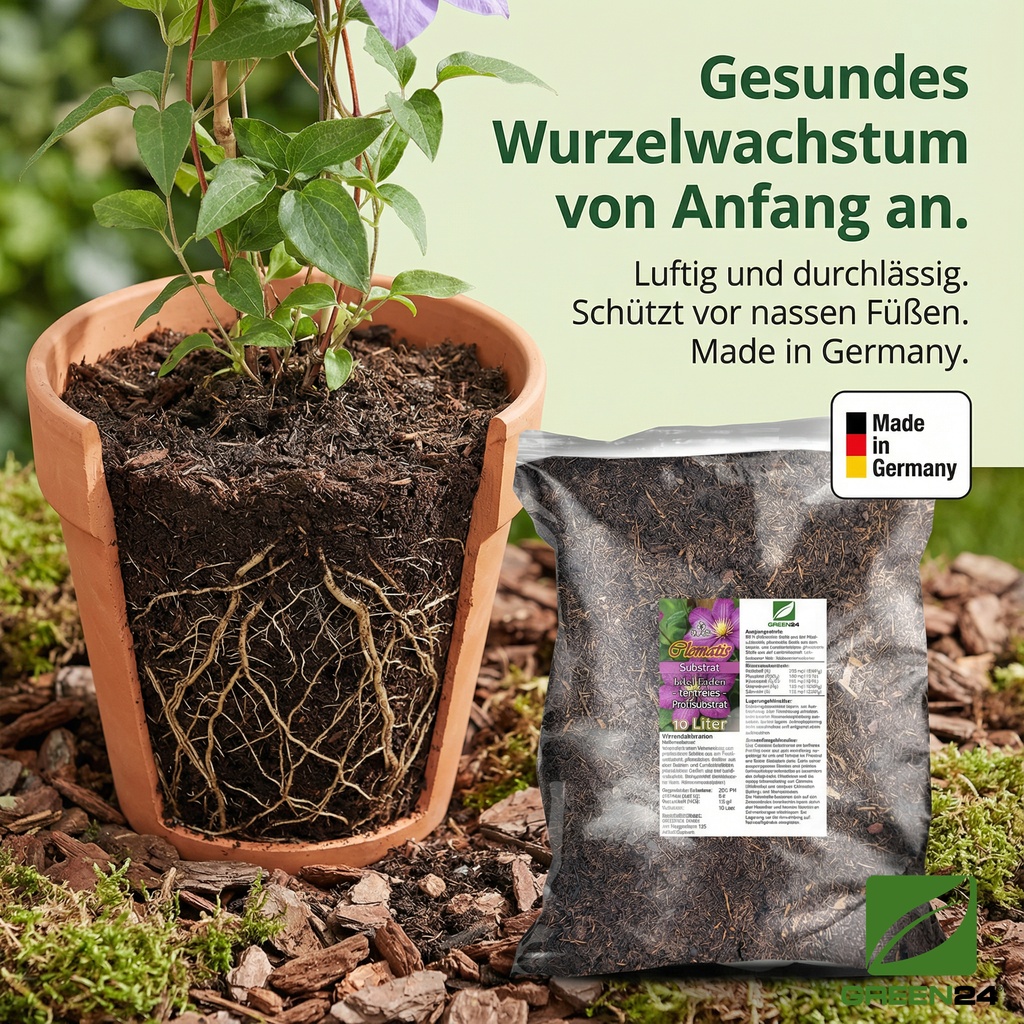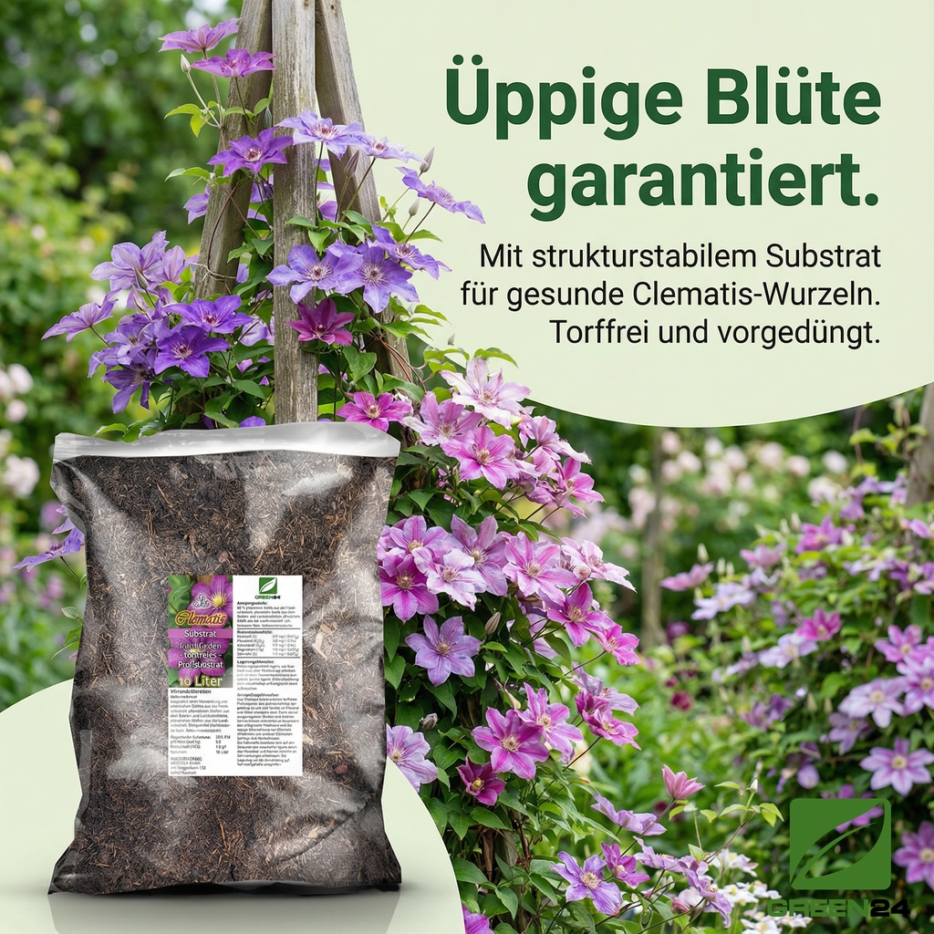 Gebrauchsfertiges, torffreies Kultursubstrat zur Pflanzung von Clematis und anderen Kletterpflanzen im Freiland und in großen Pflanzgefäßen. Für eine reiche Blüte wird eine jährliche Düngung im Frühjahr mit einem geeigneten Blühpflanzendünger empfohlen.