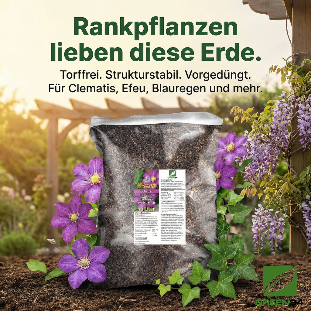 Kletterpflanzen sind die Architekten des Gartens. Sie erobern die Vertikale und verwandeln kahle Wände, Zäune und Pergolen in blühende Kunstwerke. Ihr Geheimnis liegt jedoch unter der Erde: Ein tiefes, gesundes Wurzelwerk ist die Basis für jeden Höhenflug. Besonders die prachtvolle Clematis ist hier anspruchsvoll. Sie liebt einen sonnigen Platz für ihre Blüten, aber ihre Wurzeln benötigen einen kühlen, schattigen und vor allem gut durchlüfteten Boden. Staunässe ist ihr größter Feind und Hauptursache für die gefürchtete Clematiswelke. Unsere PROFI LINIE Clematis & Kletterpflanzen Erde ist die Antwort auf diese Herausforderung. Die 100% torffreie Rezeptur ist extrem strukturstabil, sorgt für eine perfekte Drainage und verhindert Wurzelfäulnis. Gleichzeitig liefert sie eine ausgewogene Nährstoffversorgung für monatelange Blütenpracht.