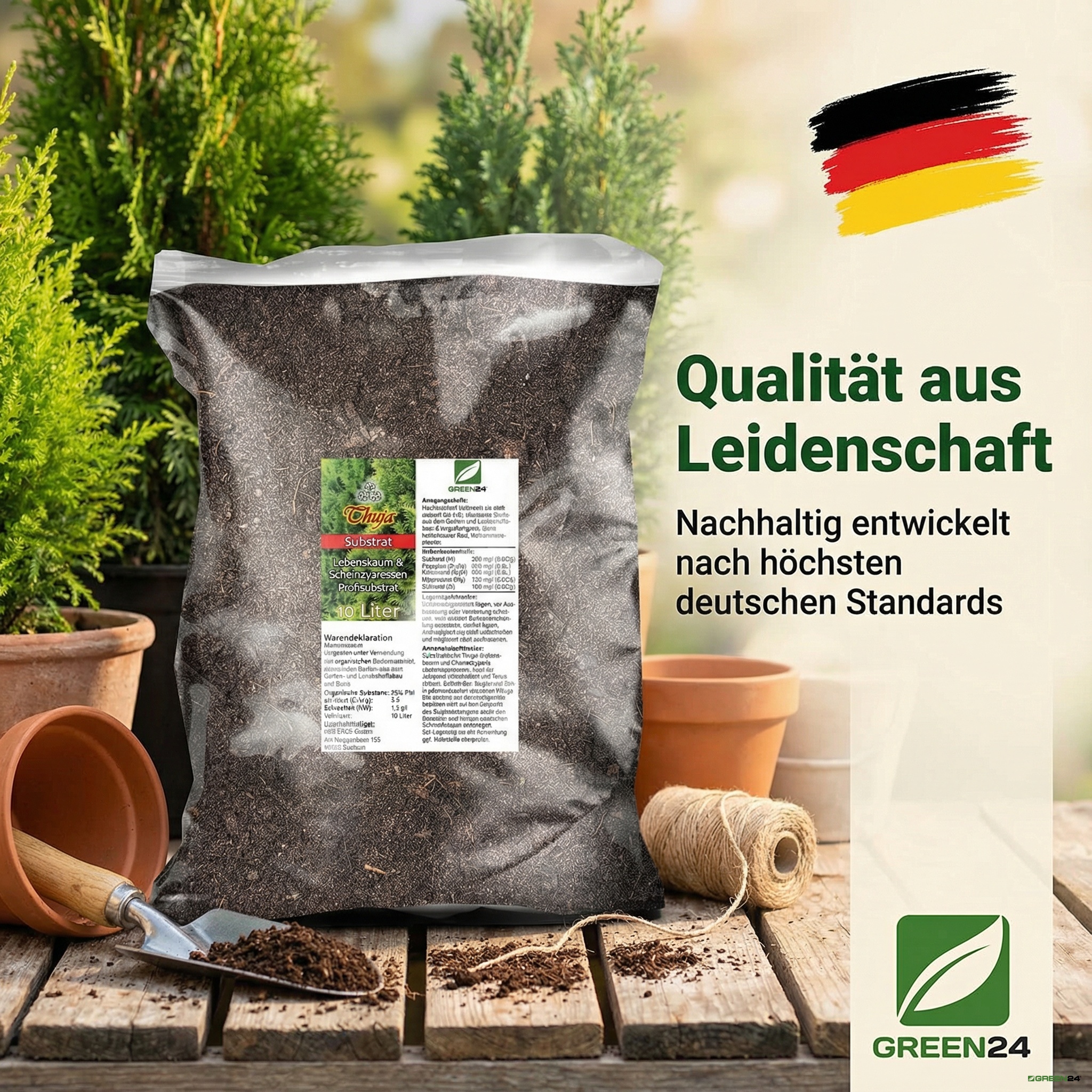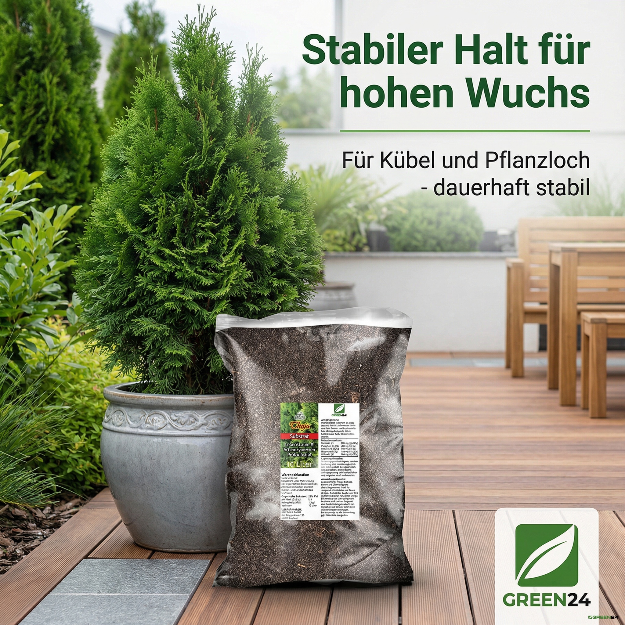 Gebrauchsfertiges Kultursubstrat zur Pflanzung von Thuja, Scheinzypressen und anderen immergrünen Heckenpflanzen. Nach 4 bis 6 Wochen mit einer gezielten Koniferen-Düngung beginnen, um ein dauerhaft dichtes und gesundes Wachstum zu gewährleisten.