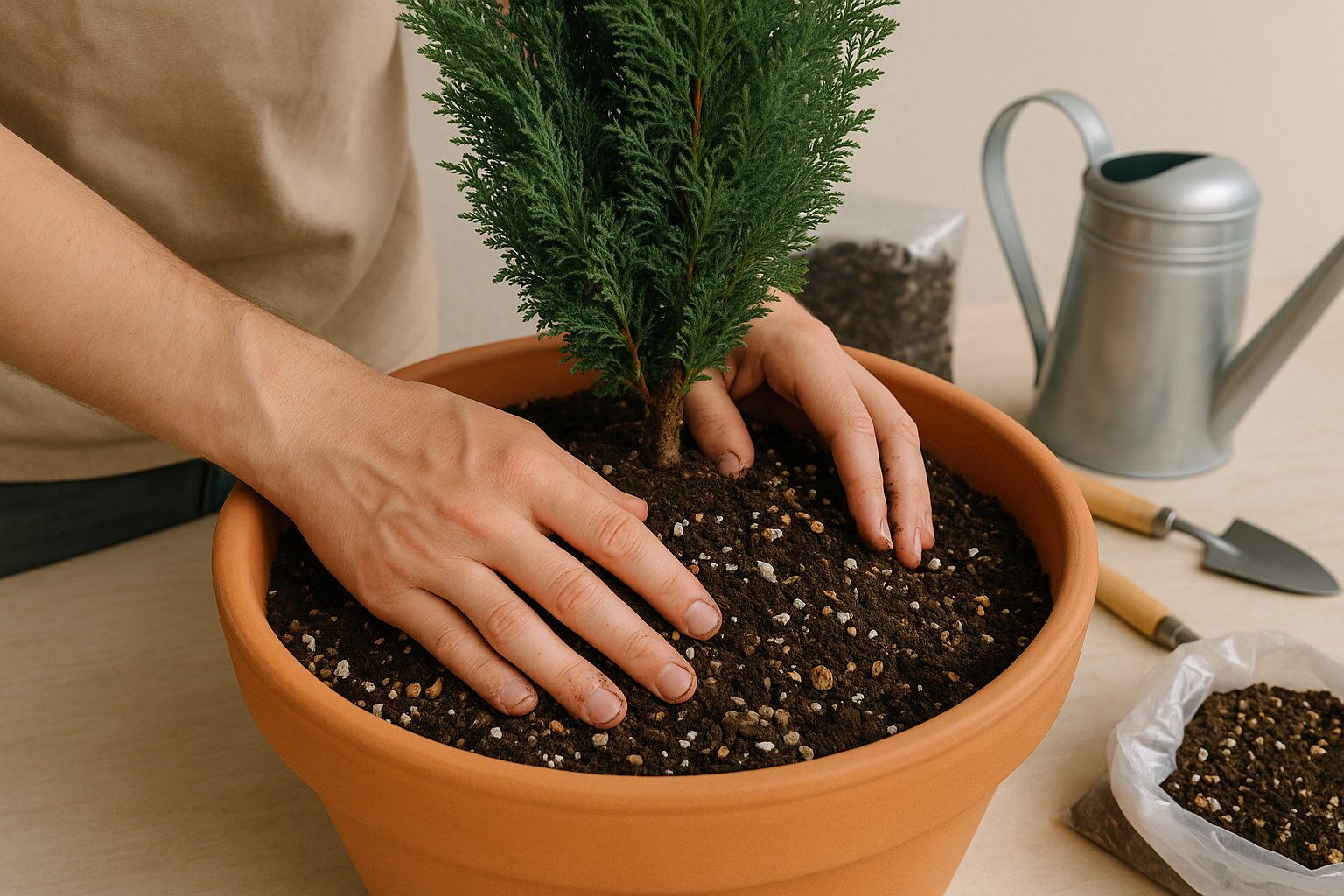 Wählen Sie einen hohen, schlanken Topf, der zur Wuchsform der Zypresse passt und ausreichend Stabilität bietet.