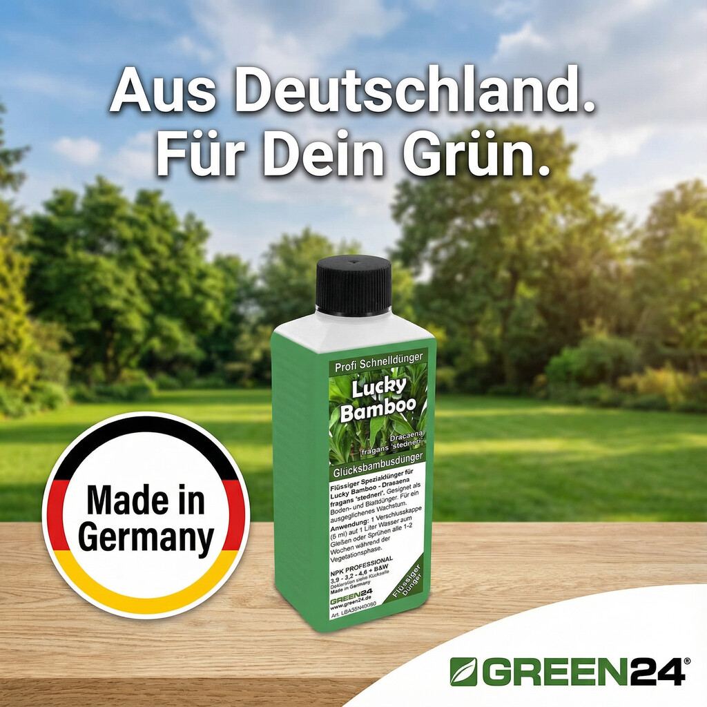 Wir kennen dieses Gefühl nur zu gut. Aus dieser Erfahrung heraus – und dem Wunsch, diesen besonderen Pflanzen ein langes, gesundes Leben zu schenken – haben wir unseren GREEN24 Glücksbambus Dünger entwickelt. Es ist kein Allzweckdünger, sondern ein speziell für die Bedürfnisse der Dracaena sanderiana in Wasserkultur konzipiertes Lebenselixier.
