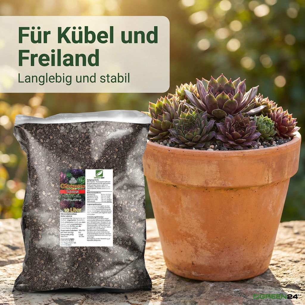 Gebrauchsfertiges Kultursubstrat zur Pflanzung von Steingartenpflanzen, Sukkulenten und für extensive Dachbegrünungen. Eine Nachdüngung ist in der Regel nicht notwendig und oft sogar schädlich. Wenn überhaupt, nur alle 2-3 Jahre sparsam mit einem Kakteendünger düngen.